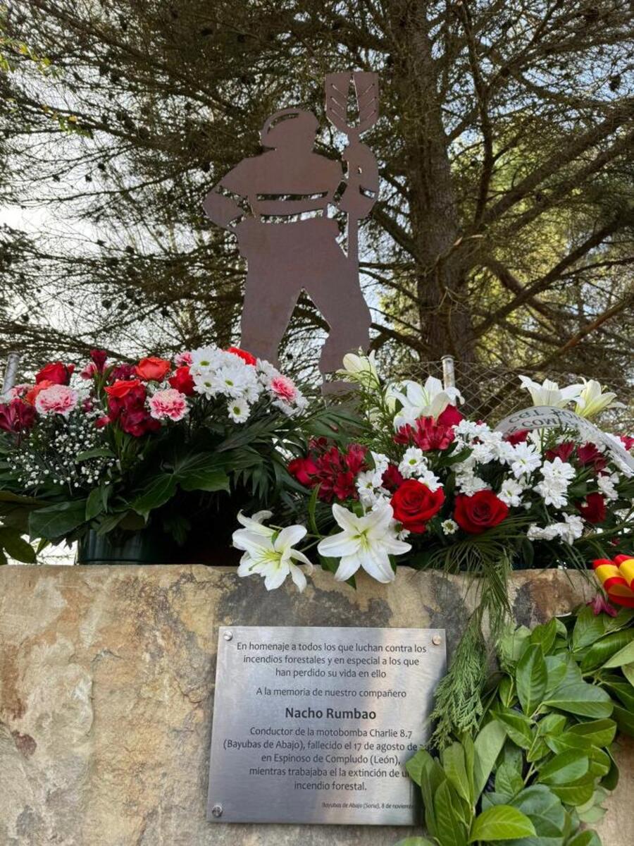 Ayer, la familia de Nacho Rumbao, el bombero que falleció tratando de sofocar el fuego de Espinosa de Compludo, en León, asistió al homenaje del consistorio de Bayubas de Abajo. Fueron además agentes medioambientales y amigos.