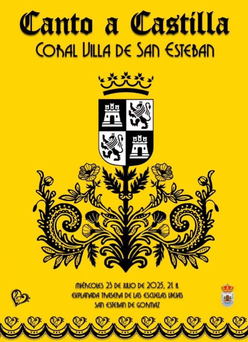 A las 21:00h, detrás de las Escuelas Viejas de San Esteban de Gormaz, la Coral Villa de San Esteban ofrecerá un concierto titulado "Cantamos a Castilla", dentro de las actividades de su 25º aniversario. La actuación, de aproximadamente una hora, se dividirá en tres bloques: música castellana tradicional recogida por grandes musicólogos, una selección de folk actual que reinterpreta temas antiguos, y un homenaje al mítico grupo Nuevo Mester de Juglaría.