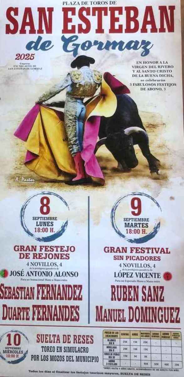 San Esteban de Gormaz se prepara para vivir con su feria taurina en el marco de las fiestas patronales en honor a la Virgen del Rivero y al Santo Cristo de la Buena Dicha, con un cartel muy esperado que contará con la presencia del matador soriano Rubén Sanz, que actuará en el martes 9 de septiembre.