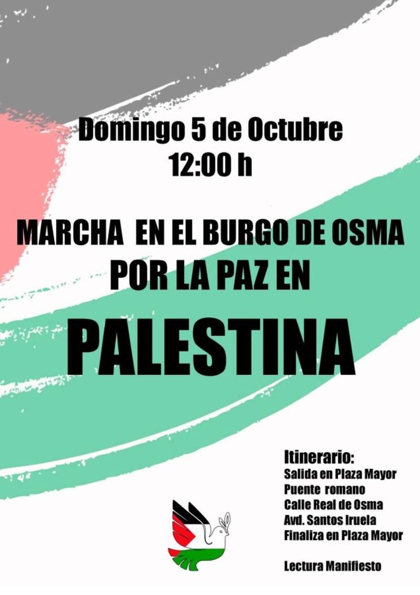Cómo ha ocurrido en muchos lugares del mundo y de nuestro país, en El Burgo de Osma, varios ciudadanos propusieron el día de ayer, este 5 de octubre, para invitar a acudir, a la manifestación que solicitaba "Paz en Palestina". Comenzó a las doce de la mañana, recorrió varias calles burgenses y oxomenses, y regresó a la plaza mayor, con la lectura del manifiesto.